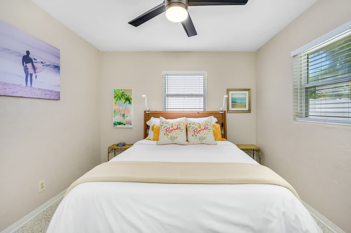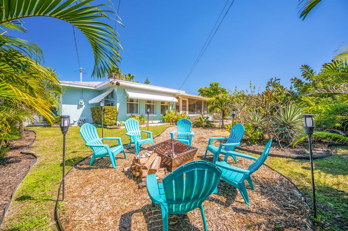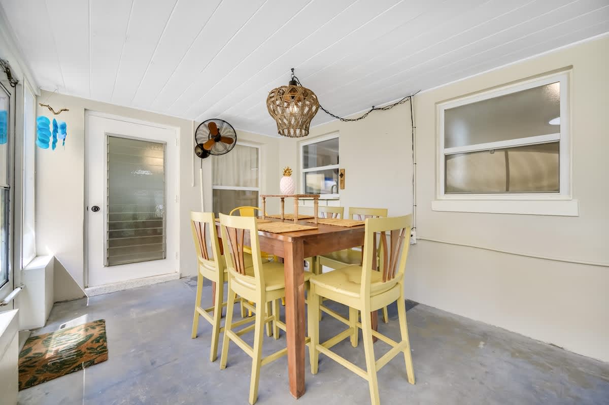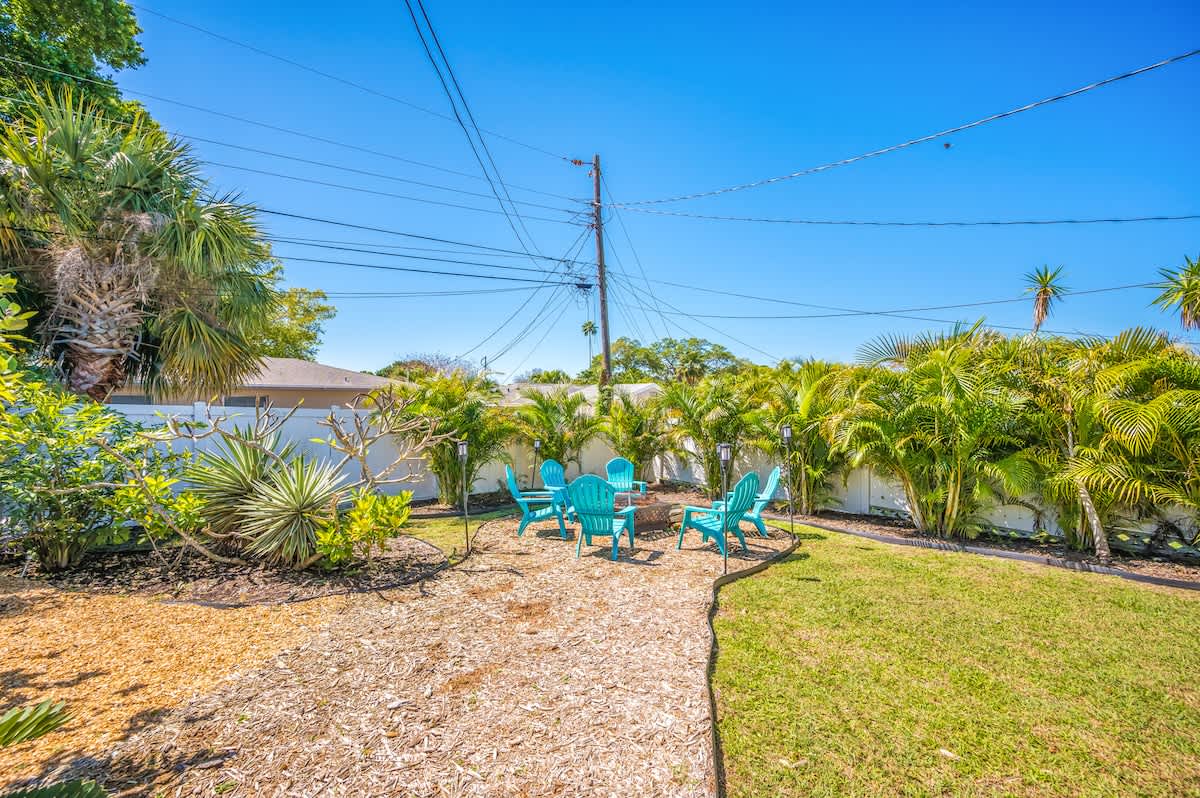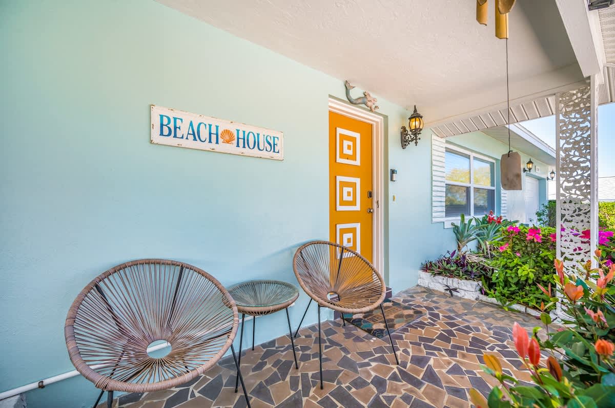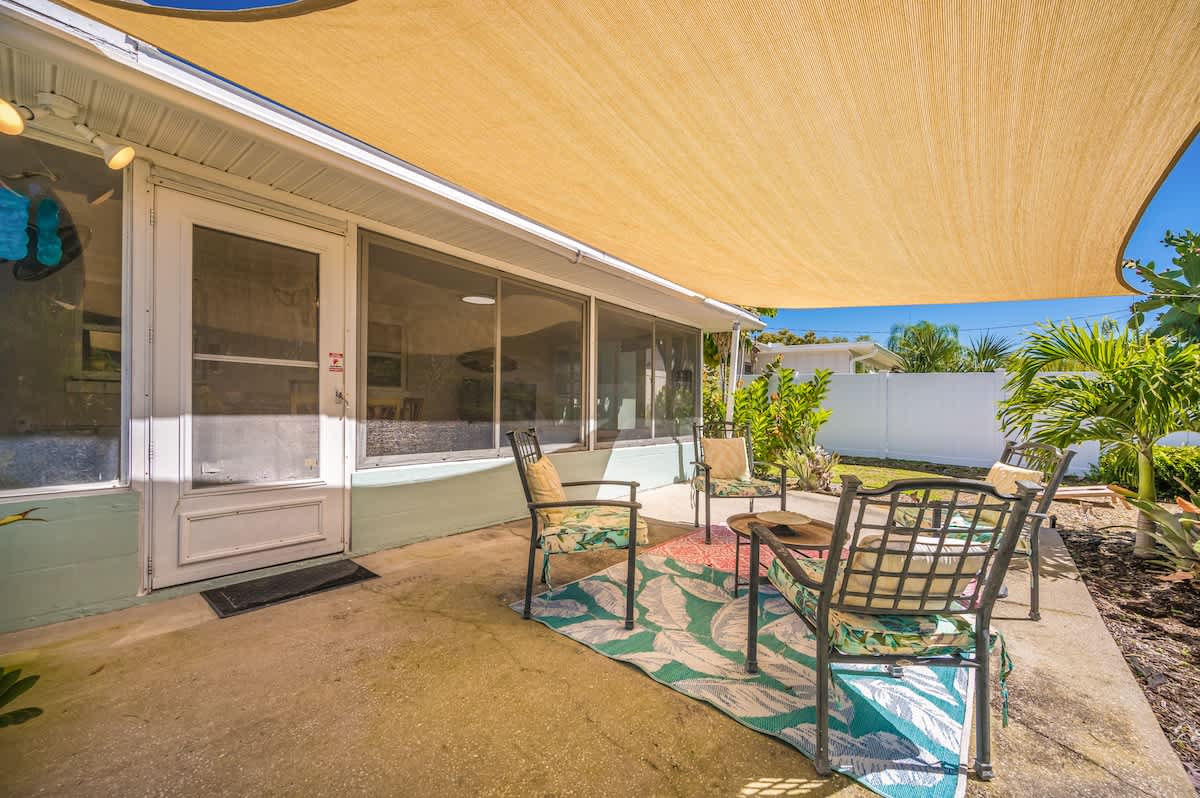 🏄🏻♀️ FIVE minutes from Madeira Beach 🏄🏼 two bedrooms + futon bed in the workspace 🏄🏾♂️ one bathroom 🏄🏽♀️ beautiful garden with native plants 🦋 🏄🏾 all beach supplies included 🏄🏼♂️ screened-in patio + outdoor fire pit 🏄🏾♀️ pet friendly 🏄🏿 sleeps six Kitchen: The space is well-equipped with essential supplies and features beautiful granite countertops and stools for meals and conversations. A convenient pass-through window leads to the Patio Bar for outdoor snacks and drinks. A Keurig with K-Cups, sugar, and stirrers is available for enjoying coffee on the back patio. 🥥 Living Room: This cozy space features a chic gray sectional sofa, faux greenery, beachy wall decor, and a standout oversized Roku TV with Fubo channel access for sports fans. 🌺 Primary Bedroom: The room includes a king bed with luxury white bedding, a full-length mirror, USB clock, and electrical outlets. Amenities also consist of a luggage rack, hangers, and a Roku TV remote for easy control of local and sports channels like ESPN through a Fubo subscription. 🌴 Secondary Bedroom: The room features a queen bed with white linens, a full-length mirror, a clock with USB outlets, and two reading lights. Additionally, it includes a luggage rack, hangers, and a dresser for storage needs. 🍊 Florida Room: This spot is ideal for relaxing while working or sending a brief email. The stylish green velvet futon transforms into a Full-Sized Bed, with all bedding conveniently stored in the hallway closet. An additional three-inch thick foam pad, encased in plastic with a zipper, offers extra comfort – please keep it in the casing. For your reading enjoyment, you will also find a book that matches the theme, The Surf Shack. 🐚 Screened Patio, aka THE TIKI BAR: It's a perfect spot to relax, with soothing bird songs and a spacious TV controlled by Roku, offering local and news channels as well as ESPN. There's a convenient pass-through window for drinks from the kitchen, but please do not move the securely plugged charging outlet. 🏄🏻♀️ Backyard: Experience a captivating rainforest setting with native plants and a cozy fire pit area. If booking, please review the "Fire Pit Guidelines" in the Welcome binder. Enjoy stunning sunset views from the backyard or take a short drive to the beach for more scenic beauty. ✨