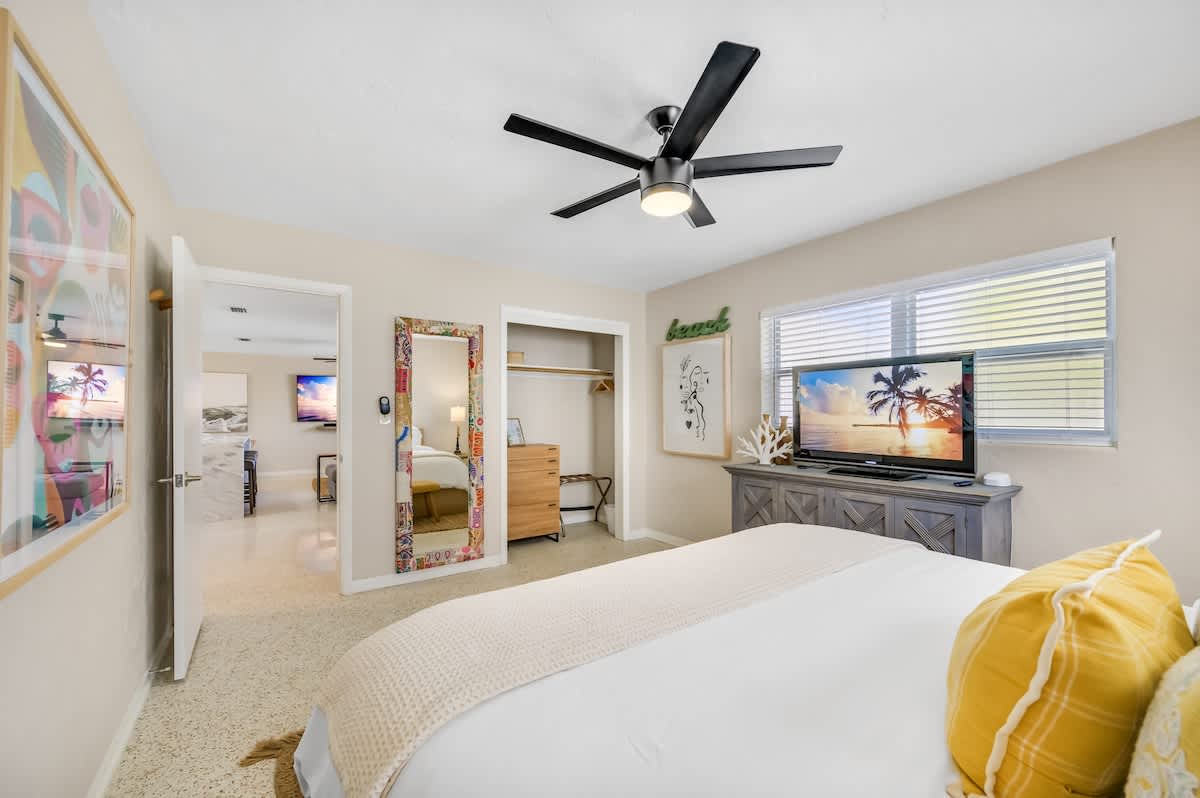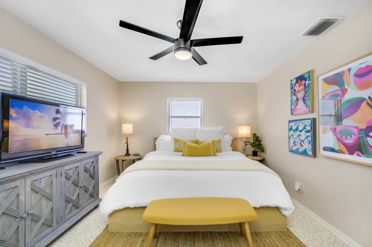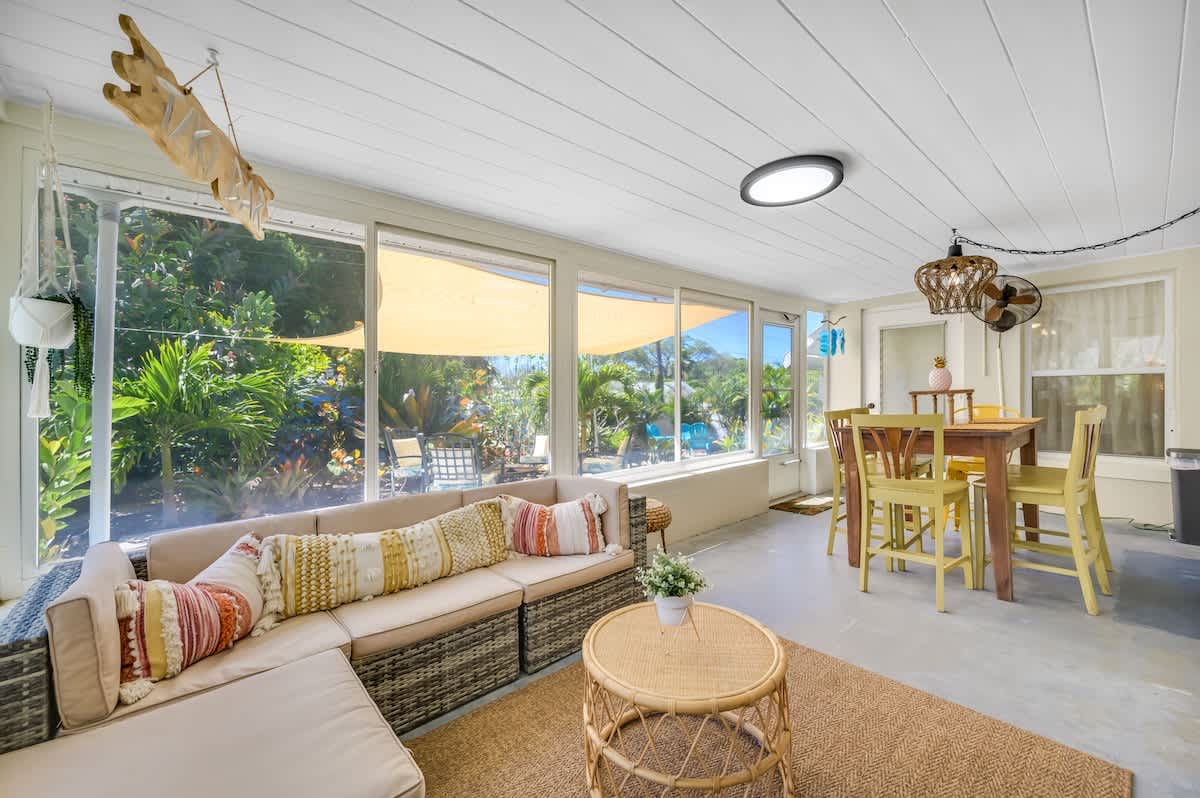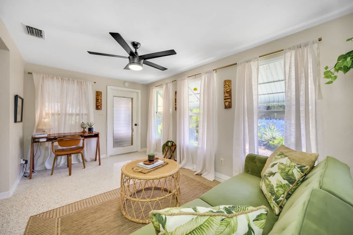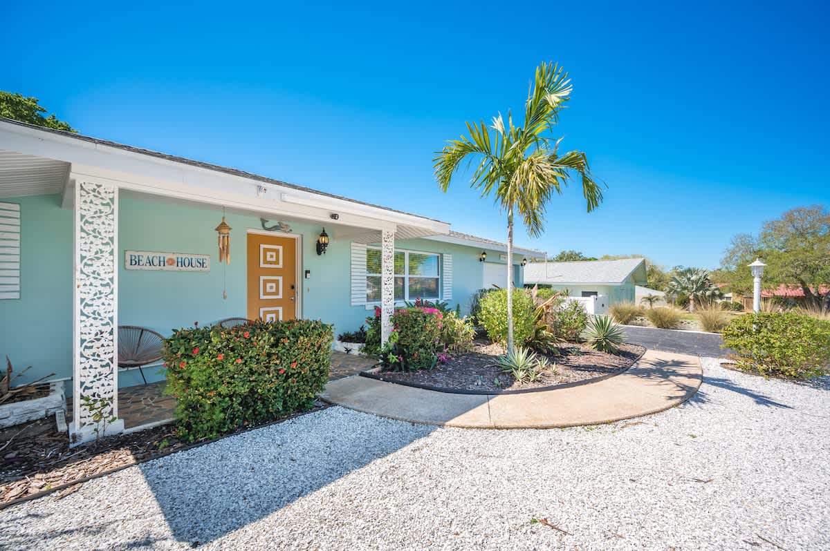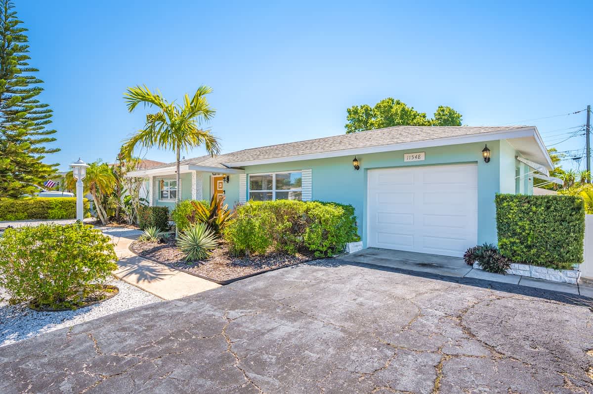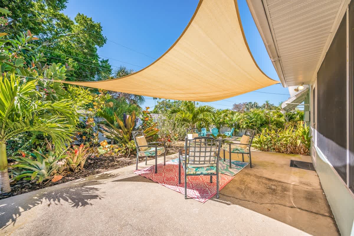 🏄🏻♀️ FIVE minutes from Madeira Beach 🏄🏼 two bedrooms + futon bed in the workspace 🏄🏾♂️ one bathroom 🏄🏽♀️ beautiful garden with native plants 🦋 🏄🏾 all beach supplies included 🏄🏼♂️ screened-in patio + outdoor fire pit 🏄🏾♀️ pet friendly 🏄🏿 sleeps six Kitchen: The space is well-equipped with essential supplies and features beautiful granite countertops and stools for meals and conversations. A convenient pass-through window leads to the Patio Bar for outdoor snacks and drinks. A Keurig with K-Cups, sugar, and stirrers is available for enjoying coffee on the back patio. 🥥 Living Room: This cozy space features a chic gray sectional sofa, faux greenery, beachy wall decor, and a standout oversized Roku TV with Fubo channel access for sports fans. 🌺 Primary Bedroom: The room includes a king bed with luxury white bedding, a full-length mirror, USB clock, and electrical outlets. Amenities also consist of a luggage rack, hangers, and a Roku TV remote for easy control of local and sports channels like ESPN through a Fubo subscription. 🌴 Secondary Bedroom: The room features a queen bed with white linens, a full-length mirror, a clock with USB outlets, and two reading lights. Additionally, it includes a luggage rack, hangers, and a dresser for storage needs. 🍊 Florida Room: This spot is ideal for relaxing while working or sending a brief email. The stylish green velvet futon transforms into a Full-Sized Bed, with all bedding conveniently stored in the hallway closet. An additional three-inch thick foam pad, encased in plastic with a zipper, offers extra comfort – please keep it in the casing. For your reading enjoyment, you will also find a book that matches the theme, The Surf Shack. 🐚 Screened Patio, aka THE TIKI BAR: It's a perfect spot to relax, with soothing bird songs and a spacious TV controlled by Roku, offering local and news channels as well as ESPN. There's a convenient pass-through window for drinks from the kitchen, but please do not move the securely plugged charging outlet. 🏄🏻♀️ Backyard: Experience a captivating rainforest setting with native plants and a cozy fire pit area. If booking, please review the "Fire Pit Guidelines" in the Welcome binder. Enjoy stunning sunset views from the backyard or take a short drive to the beach for more scenic beauty. ✨