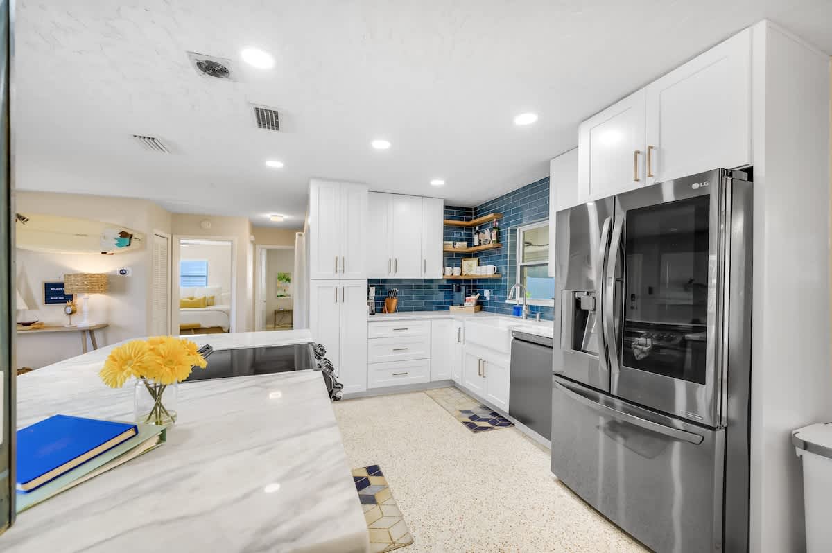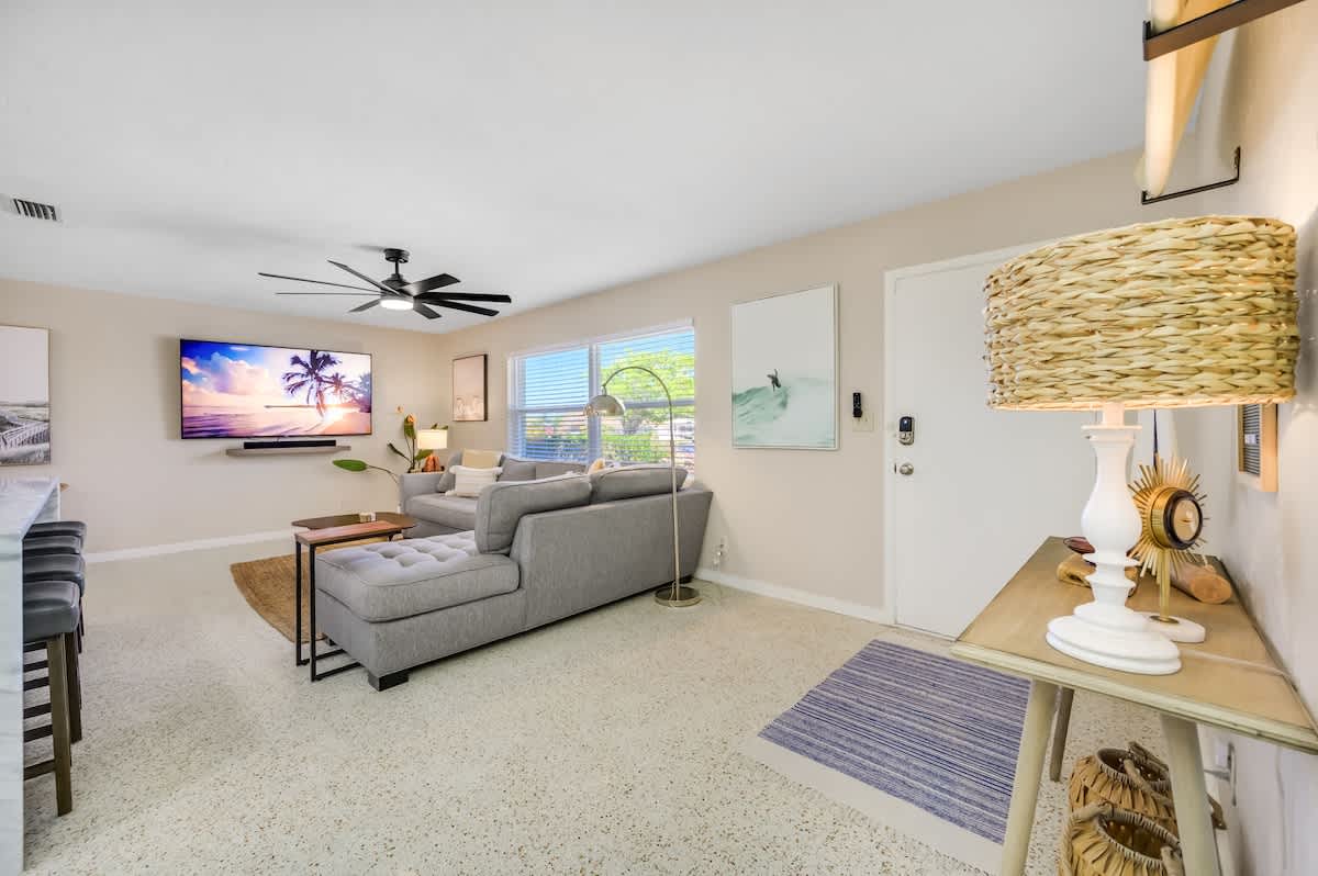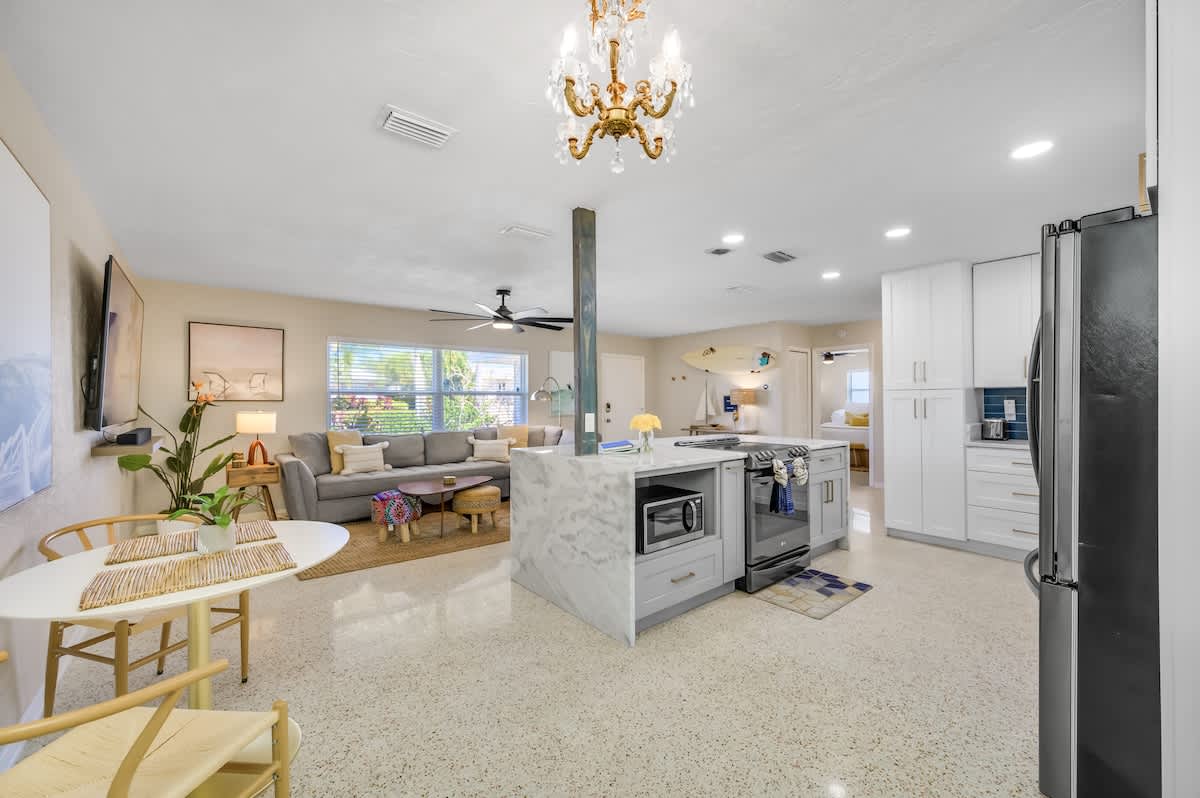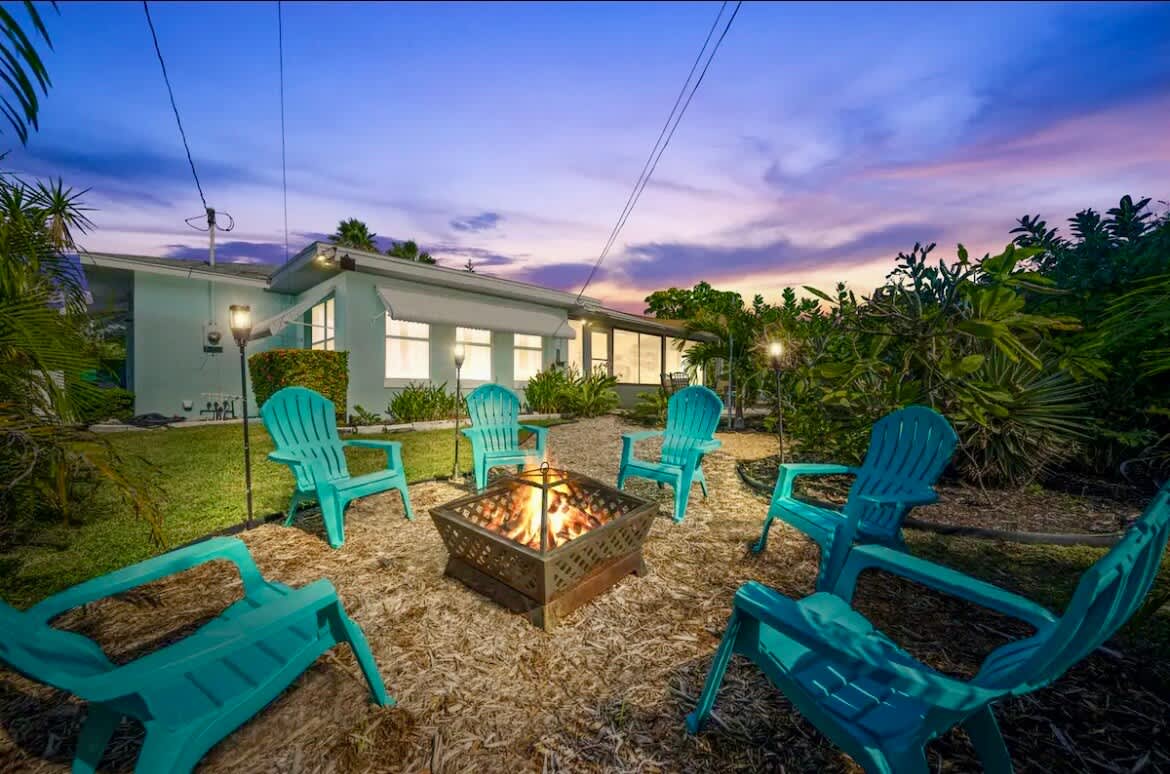 Experience serenity in Surf INN, featuring a lush garden and cozy fire pit, just minutes from the sun-kissed shores of Madeira Beach. Recently renovated to preserve its 1959 allure, this one-story, two-bedroom, full-futon, one-bathroom vacation rental features stylish surf-shack decor with rattan details and original terrazzo flooring. It also includes a fully equipped kitchen with granite countertops and a private backyard with a fire pit. Soak up the good vibes and catch some waves, dude! 🤙🏽