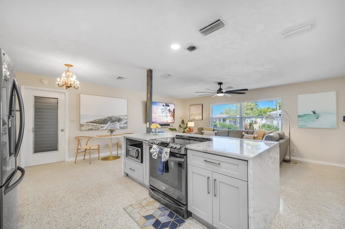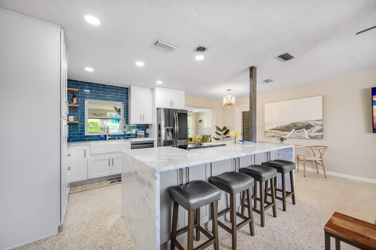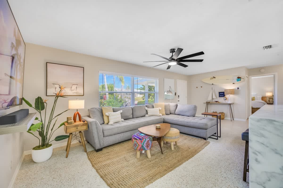 Experience serenity in Surf INN, featuring a lush garden and cozy fire pit, just minutes from the sun-kissed shores of Madeira Beach. Recently renovated to preserve its 1959 allure, this one-story, two-bedroom, full-futon, one-bathroom vacation rental features stylish surf-shack decor with rattan details and original terrazzo flooring. It also includes a fully equipped kitchen with granite countertops and a private backyard with a fire pit. Soak up the good vibes and catch some waves, dude! 🤙🏽